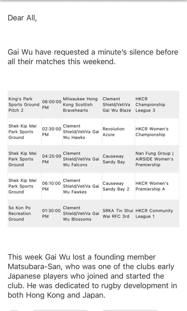 僕は2011年にGaiWuに参加させてもらった。彼はその時にはすでにラグビーを引退しており中国深圳に赴任していた。毎週土曜日の朝にハッピーバレーで開催されていたGaiWu主催のミニラグビーに一人娘をつれて参加してた。遠慮がちな男でGaiWuの創設時代のメンバーだということは本人から聞いた記憶はない。僕よりも年下ということもあって控え気味だったのかもしれない。癌だった。9年間ものながい間戦ったんだろう。その間も体調が復活すると香港にして「好きなことをやりますよ」と笑っていた。きつかっただろうなと思う。生きたかっただろうと思う。奥様と娘を残して行かなけらばならないその気持ちを察するにはあまりある。心からご冥福をお祈りしたい。お疲れ様でした。今週末のGaiWuチームの5試合でKOの前に黙祷が捧げられることが決まっている。松原英紀 R.I.P