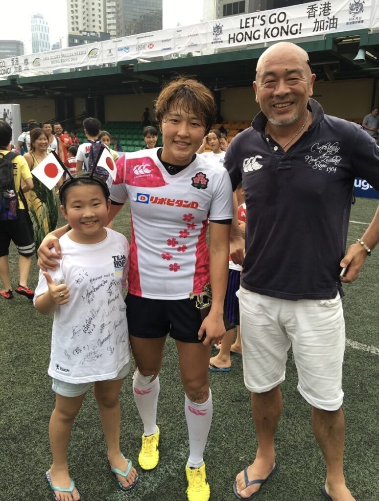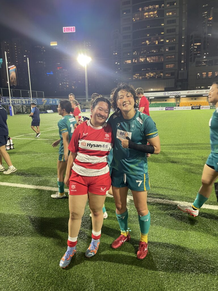 多くの観衆が帰りはじめた啓徳スタジアムの最前列でセブンスの余韻を惜しむようにを娘と二人で一面に広がる緑の芝を眺めていた。足元にはカールスバーグのジョグの容器と大き目の紙コップとが多く散らばっている。ピッチ中央のHONG KONG Sevens 2026の表彰台のまわりには男子決勝で連覇を狙ったアルゼンチンを大差で破った南アフリカ、女子は圧倒的な強さでオーストラリアを破って4年連続優勝のニュージーランドの選手達がいくつかのグループを作って談笑している。終わったんだなぁという空虚感にも似た幸福感で満たされた感覚だ。4月14日に始まったHKFC 10sと Hong Kong Sevens の6日間は僕の香港でのラグビーシーンの記憶にしっかり残り続けるだろう。本当に楽しかった。HKFC 10sではももかがHong Kong Bauhiniasのメンバーに選ばれてプレイした。相手のNANAIRO Prismには中村知春さんもいる。女子セブンスのレジェンドだ。ももかが8歳の頃香港スタジアムで初めて会った。あれから10年、同じピッチで試合ができて夢がかなったとももかが言ってた。他にもニュージーランドのレジェンドWoodmanとも同じピッチに立てた。本当に夢のようだ。ラグビーの素敵な繋がりのみれたような気がした。